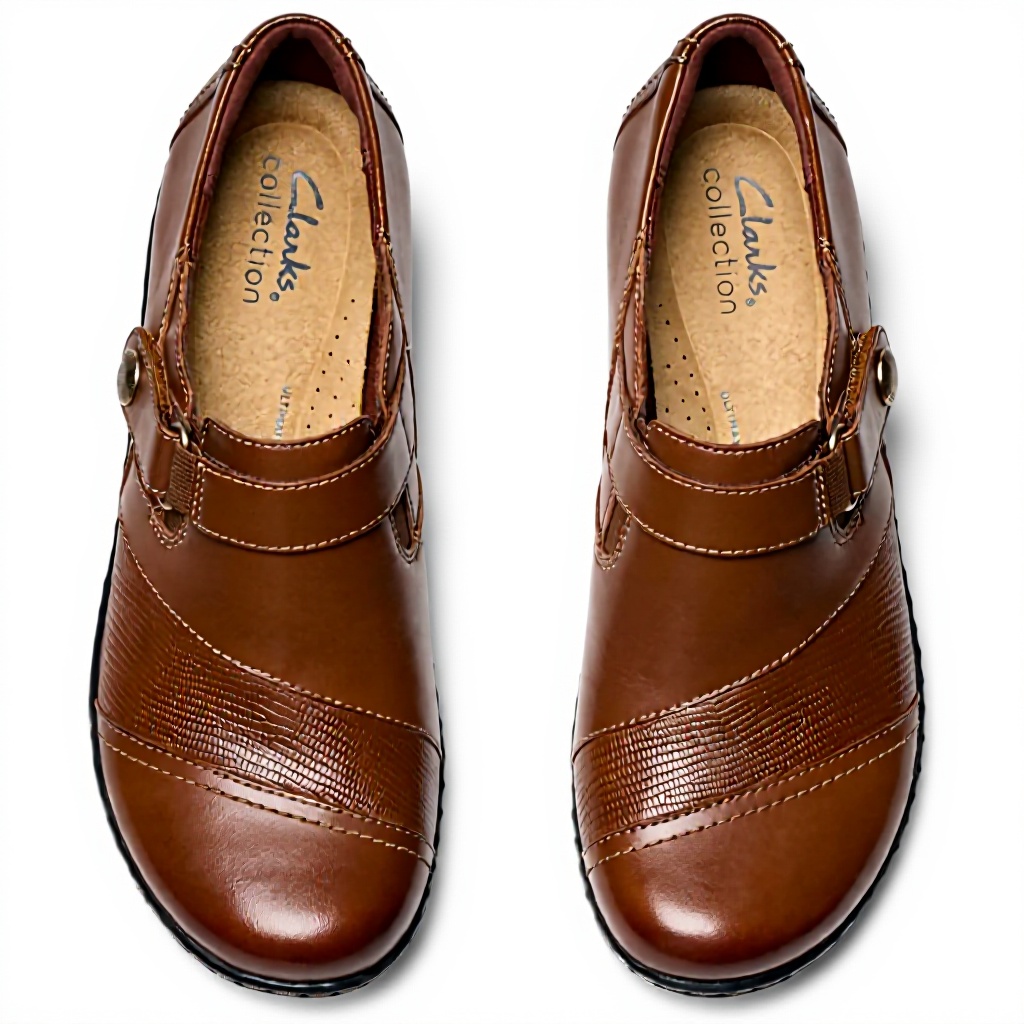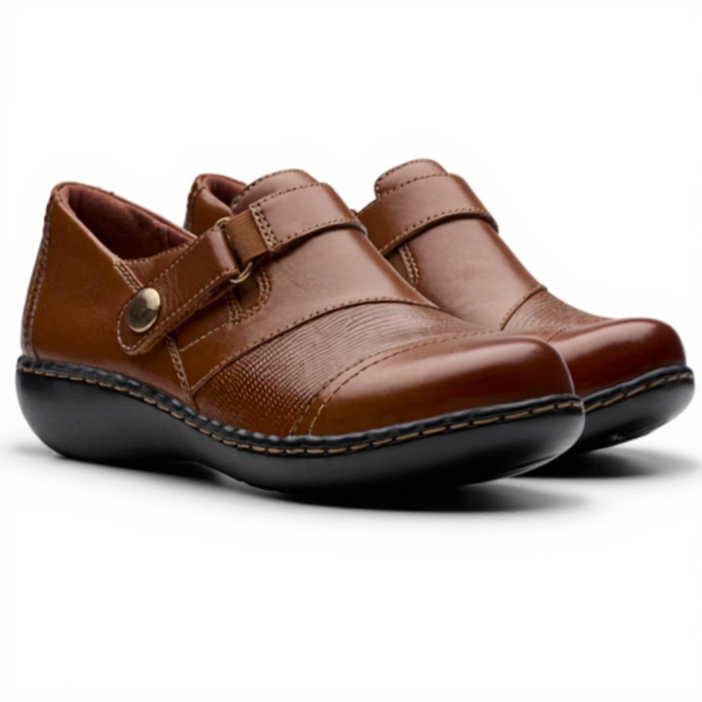 The Clarks Ashland Gem Loafer combines timeless style with modern comfort features. These women’s loafers feature a genuine leather upper that provides durability and a sophisticated appearance. The slip-on design with hook-and-loop strap closure ensures easy wear while the brass button detail adds a touch of classic elegance. The textile lining offers breathability, and the Ultimate Comfort footbed provides exceptional cushioning and support throughout the day.